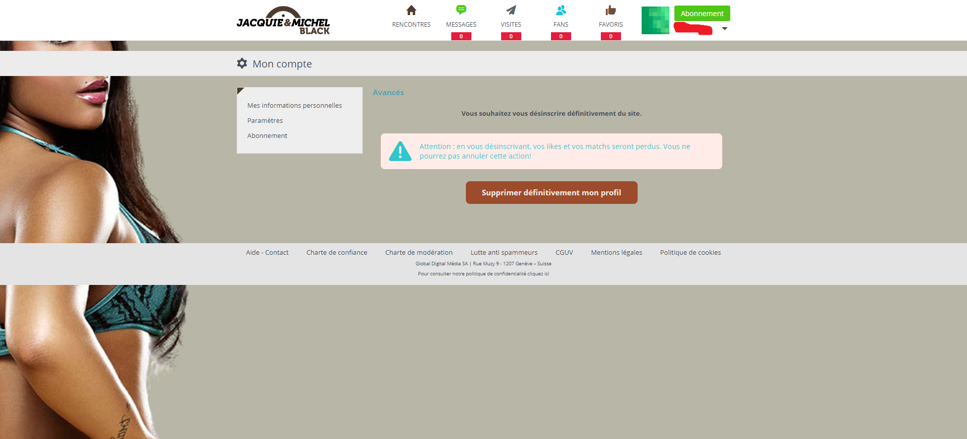 Vous avez souscrit à un Abonnement Argent, Bronze, Or ou payé une Offre d’Essai ? Pour annuler la reconduction automatique des abonnements, rendez-vous sur “Mon compte, Mes abonnements, Changer”. Le changement est instantané et vous pouvez dès lors supprimer votre compte !