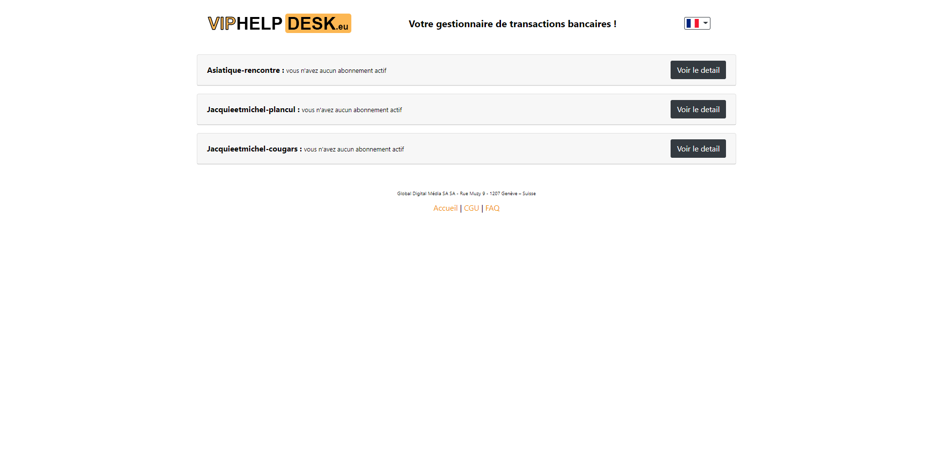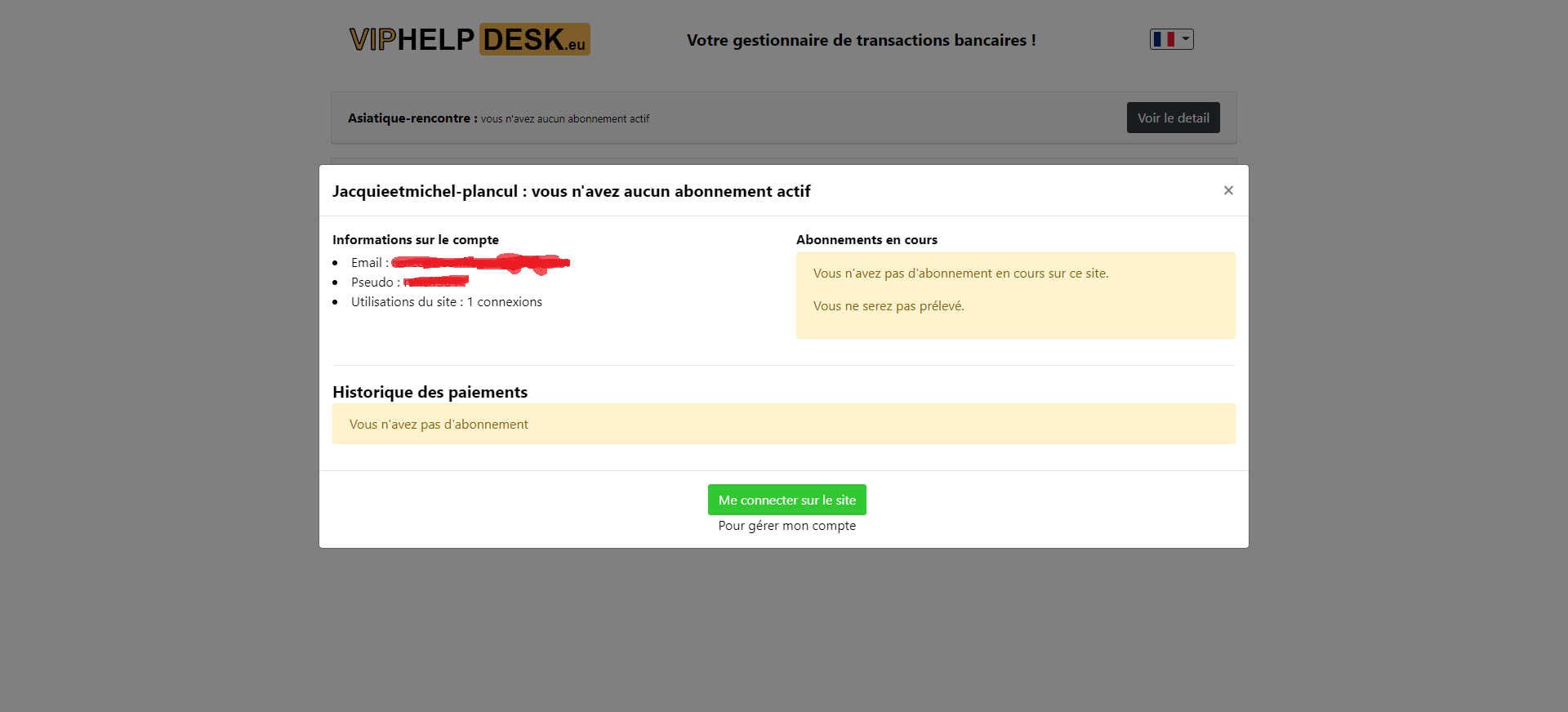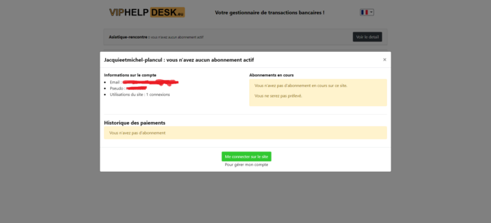 Vous pouvez aussi vous rendre sur le site Viphelpdesk.eu, indiquez votre adresse email OU votre pseudo et mot de passe OU vos coordonnées bancaires pour savoir si un abonnement (offre d’essai, abonnement OR, Argent ou Bronze) est toujours actif. Si c’est le cas, vous continuerez d’être prélevé CHAQUE mois, sauf action de Désabonnement de votre part.