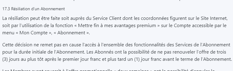 La résiliation peut être faite soit auprès du Service Client dont les coordonnées figurent sur le Site Internet, soit par l’utilisation de la fonction « Mettre fin à mes avantages premium » sur le Compte accessible par le menu « Mon Compte », « Abonnement ».