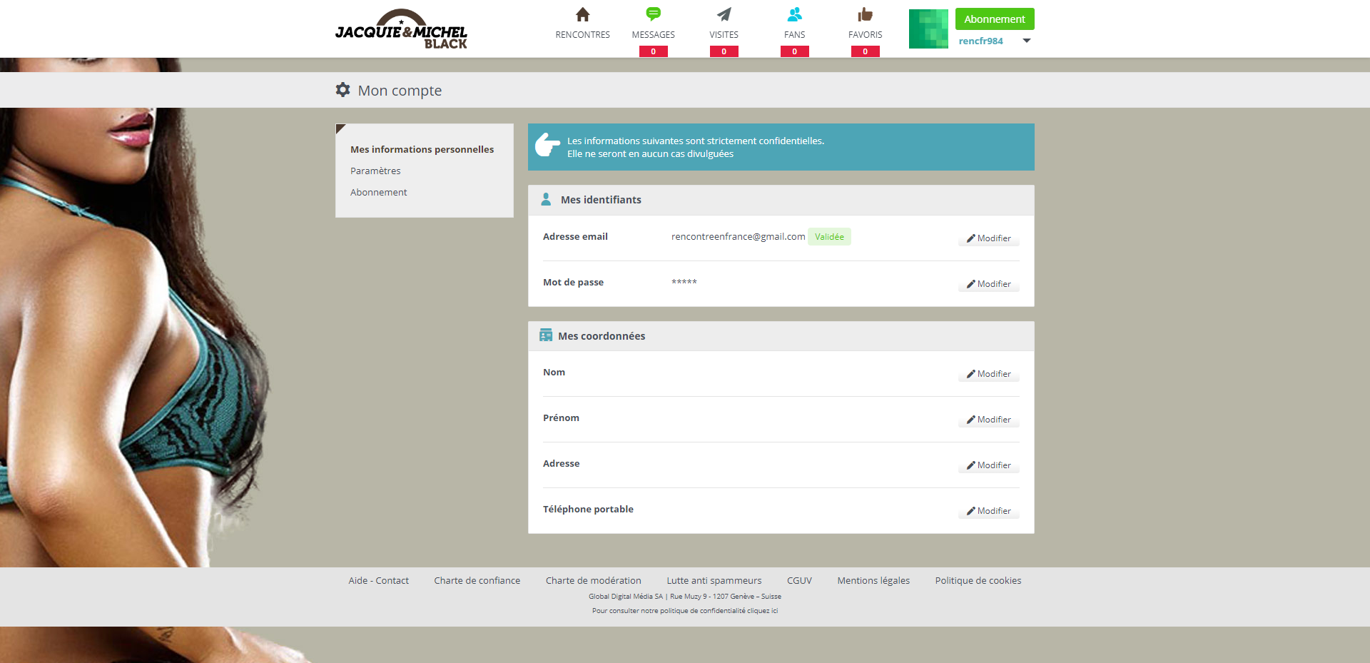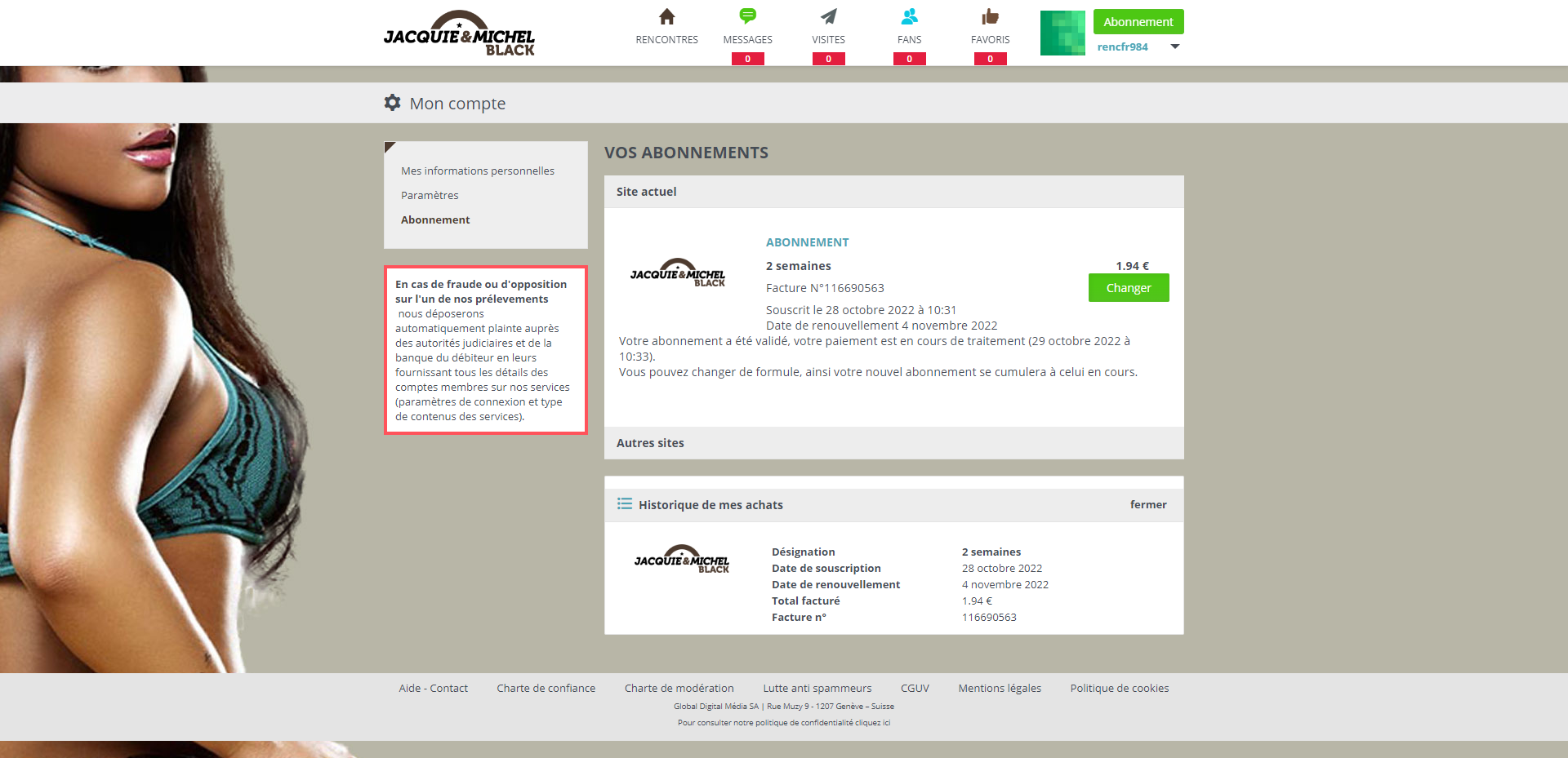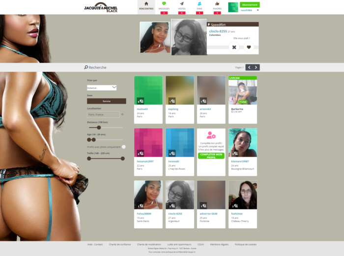 Le speedflirt facilitera vos prises de contact. Dans le menu du haut, vous découvrez aussi les messages laissés par des femmes célibataires intéressés par votre photo (n’oubliez pas d’ajouter une photographie vous mettant en valeur), les visites sur votre profil et les fans. Enfin, vous aurez accès à toutes les informations relatives à votre abonnement, comme les informations personnelles, les paramètres et votre abonnement actuel. Le numéro de facture est indiqué, la date de renouvellement et la marche à suivre pour résilier et ainsi quitter le site Jacquie et Michel Black sans être à nouveau facturé les semaines et mois suivants.