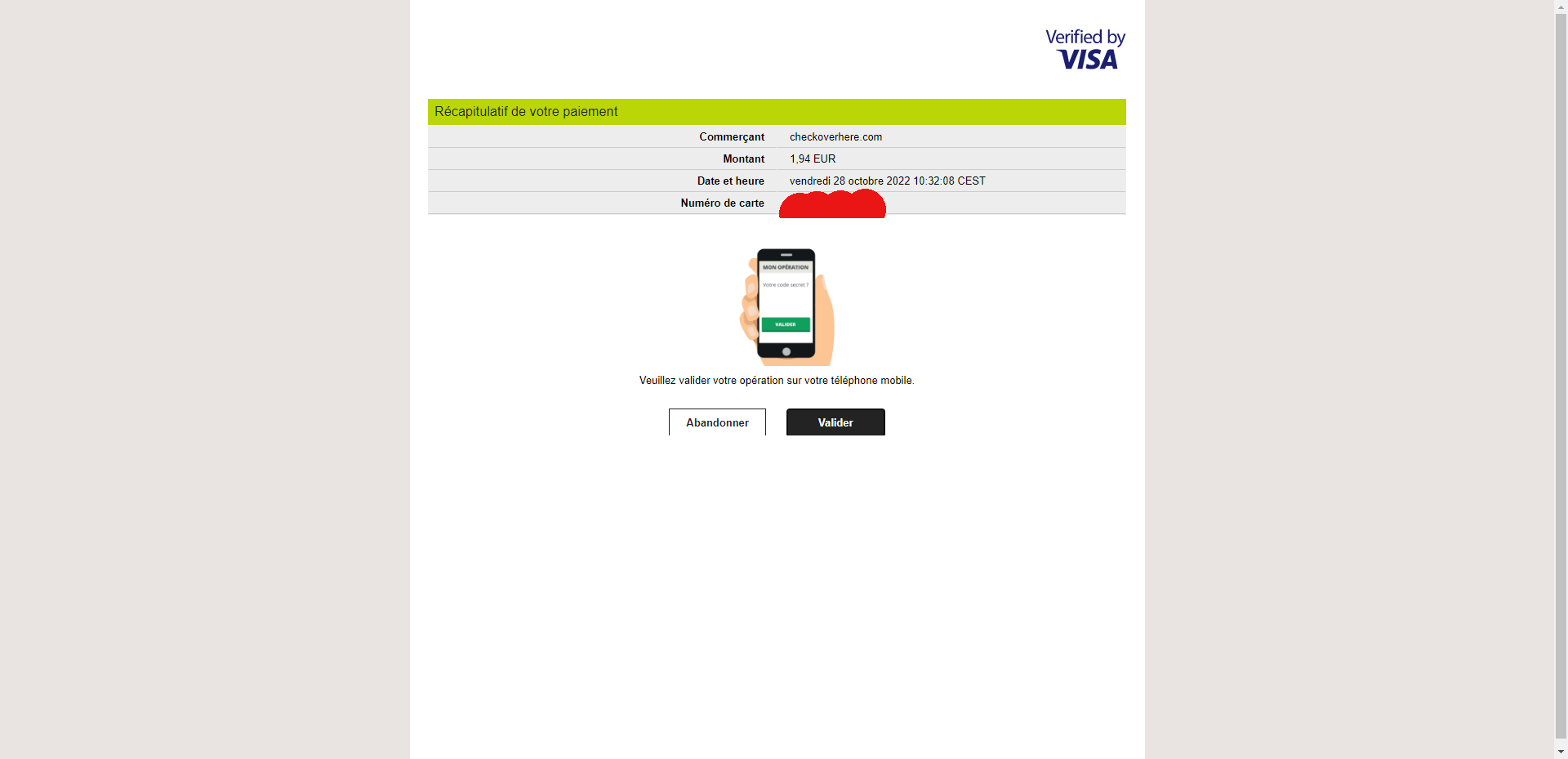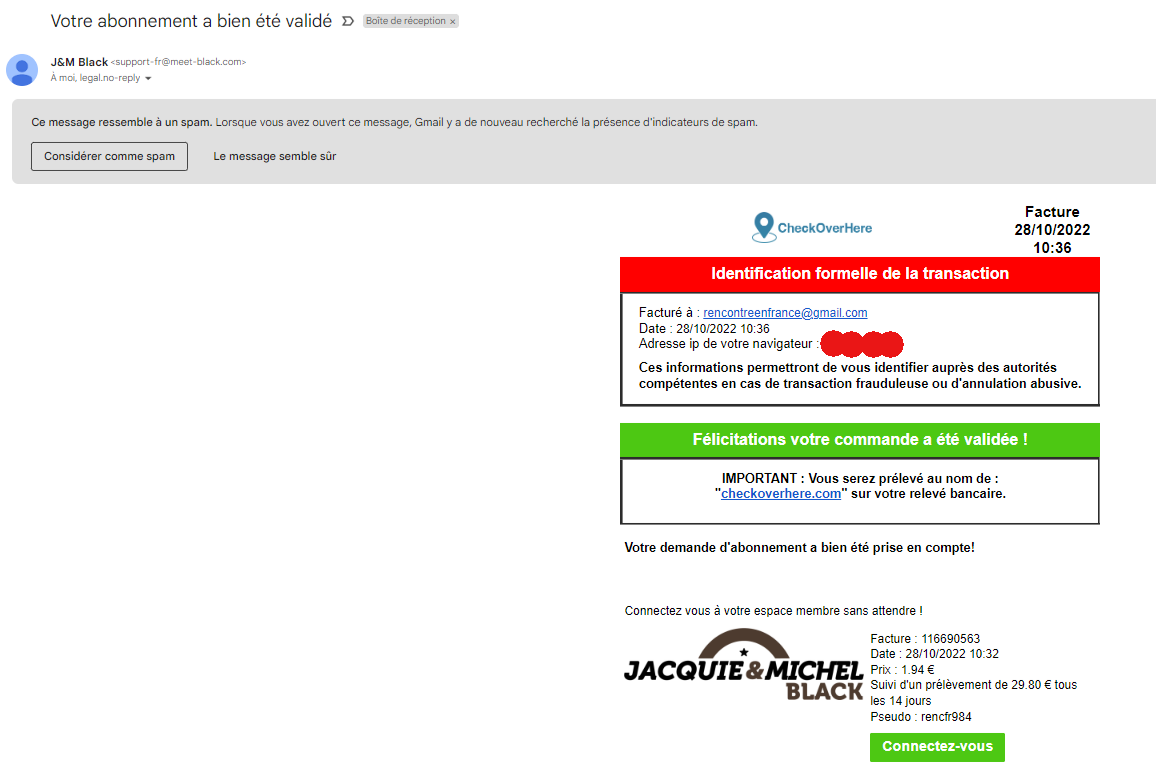 La totale discrétion est parfaitement illustrée avec l’écran de validation de la transaction affiché par mon établissement bancaire. Je ne vois pas Jacquie et Michel comme commerçant mais checkoverhere.com, un nom passe partout sans aucun lieu avec un portail de dating. Sur mon compte bancaire (consulté en ligne), je remarque le même nom et heureusement le même montant. Pas de mauvaise surprise ni de frais caché avec J&M Black !