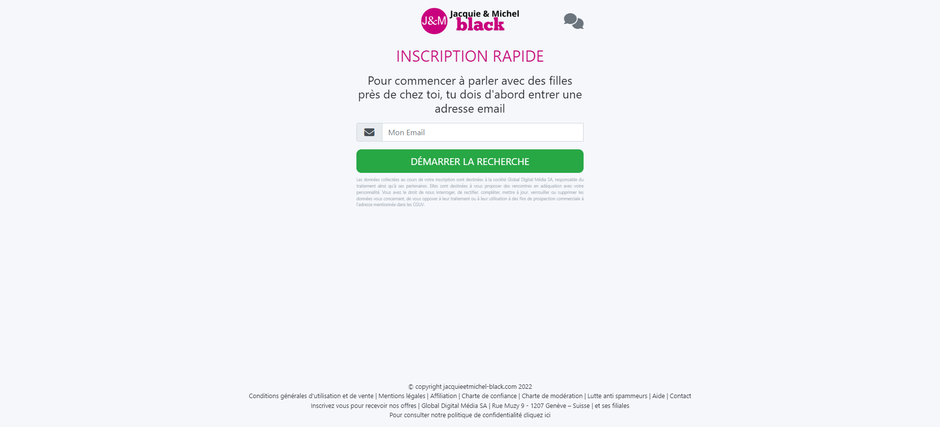 Vous retrouvez ce formulaire facile à remplir. Vous indiquerez si vous êtes un Homme (la plupart des personnes qui s’inscrivent sur Jacquie et Michel Black) ou une Femme, votre âge (supérieur à 18 ans), une adresse email valable et le pseudo. Celui-ci peut être créé automatiquement à partir de votre adresse email. Mais vous pouvez le modifier. Pour ma part, pour ce test, j’ai choisi rencfr984.