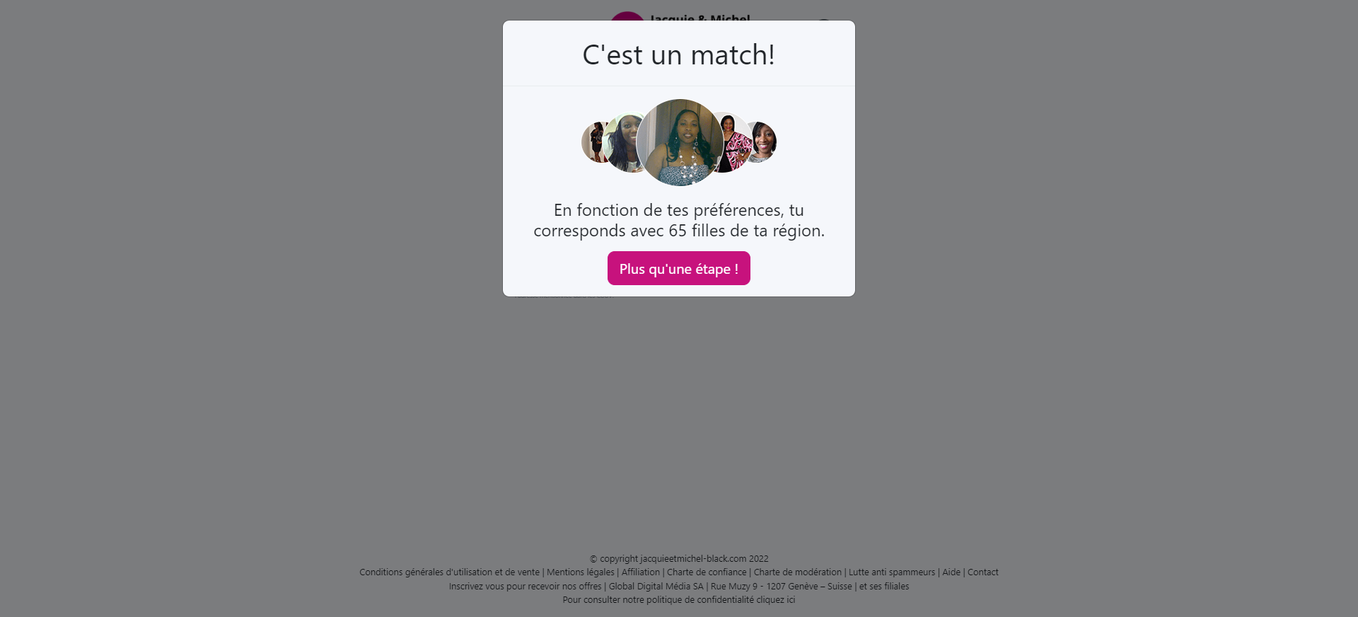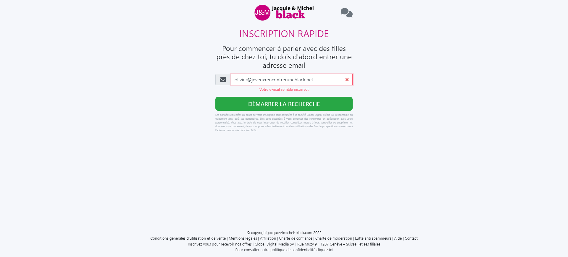 Jacquie et Michel parvient à déterminer des filles blacks correspondant à vos préférences, vivant dans votre région. C’est un match qui me permet d’entrer en relation avec 65 filles ! Il ne reste plus qu’une étape pour accéder aux offres d’abonnements Jacquie et Michel Black. Vous devrez indiquer une adresse email valide, rattachée à votre fournisseur d’accès ou non (avec un mail de type Gmail ou Outlook) voir un courriel avec un nom de domaine. J’ai fait un test avec un email original (olivier@jeveuxrencontreruneblack.net) mais le site a détecté un format non valide.