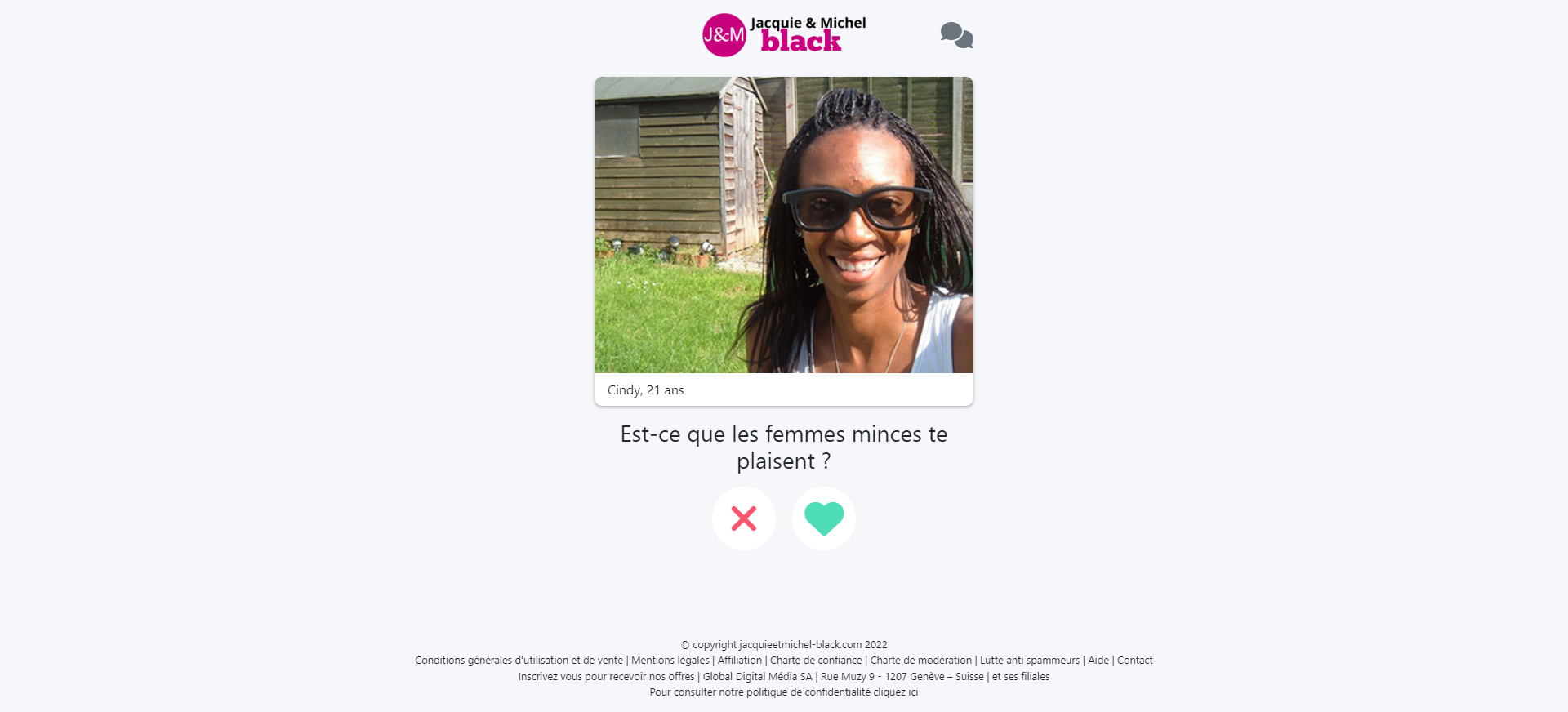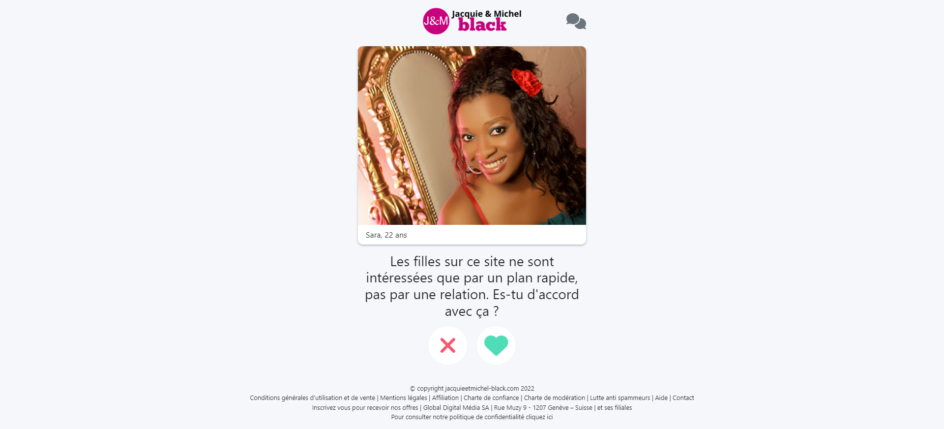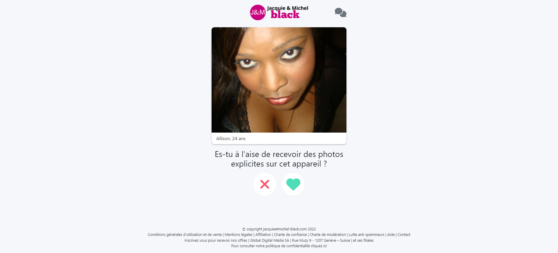 Pour vous inscrire sur ce site de rencontres affinitaire, le processus peut évoluer selon le clic effectué sur notre site. Par exemple, si vous avez cliqué sur la colonne de droite (photo ci-contre), différentes photos de femmes inscrites vous seront proposées. Vous ne parviendrez pas tout de suite sur le formulaire d’inscription (dans lequel vous préciserez votre genre, votre âge, votre email et votre pseudo). Après l’affichage de la photo de cette black à la poitrine généreuse, Jacquie et Michel vous proposera une série de profils (avec prénom et âge) que vous pourrez valider avec un cœur vert ou une croix rouge. Ainsi, ce site va découvrir votre style de femmes (morphologie, longueur des cheveux …).