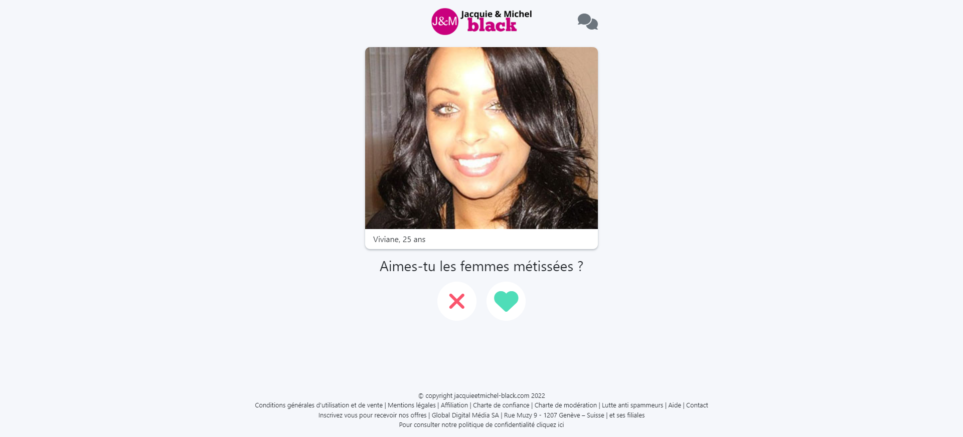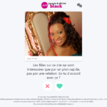 D’autres célibataires vont sont proposés. Vous aurez à répondre aux questions suivantes, toujours utiles pour définir vos préférences ! Aimes-tu les femmes métissées ? Aimes-tu les femmes de caractère ? Les filles sur ce site ne sont intéressées que par un plan rapide, pas par une relation. Es-tu d’accord avec ça ?